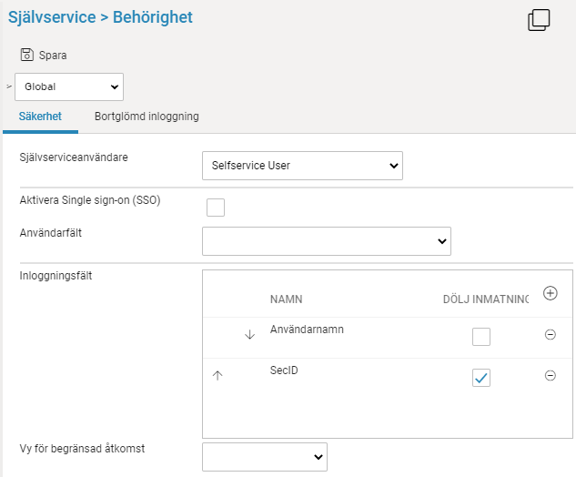 Inloggningsfält används vid traditionell inloggning och här specificeras vilka fält från kontaktkortet som användaren ska ange vid inloggning. I vårt exempel har vi valt att ha två fält för inloggningen, varav SecID-fältet räknas som lösenord och är därför markerat i kryssrutan Dölj inmatning. Detta innebär att när en användare anger SecID vid inloggning är tecknen inte synliga.