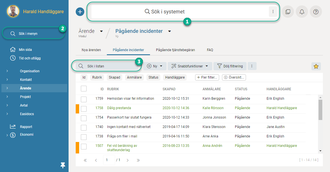 Fältet Sök i systemet använder du för att söka efter något i systemet. Klicka i fältet
