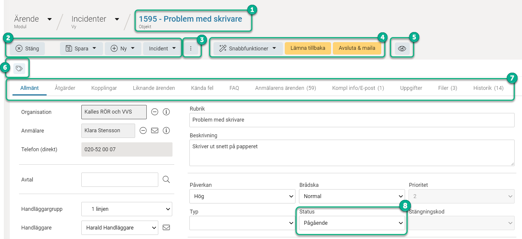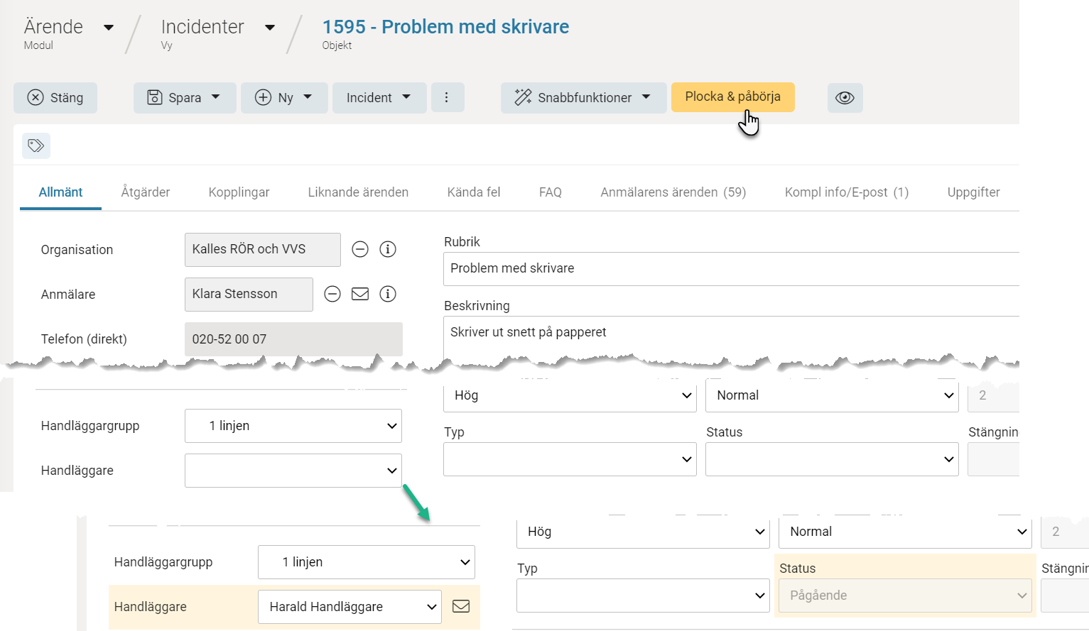 Exempel när en snabbfunktion används via en knapp för att plocka och påbörja ärendet. Bakgrundsfärgen blinkar till vid de två ändrade fälten Handläggare och Status.