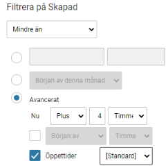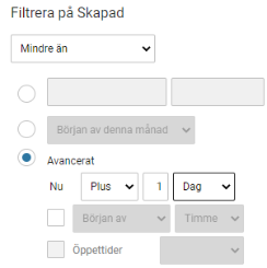 Om dynamiska filter inte räcker till, finns avancerat datumfilter. Filtret gör jämförelsen med ett "nu-värde", d.v.s. tidpunkten just nu.