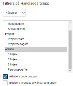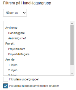 Vill du filtrera på alla grupper som den inloggade användaren tillhör markera checkboxen Inkludera inloggad användares grupper.