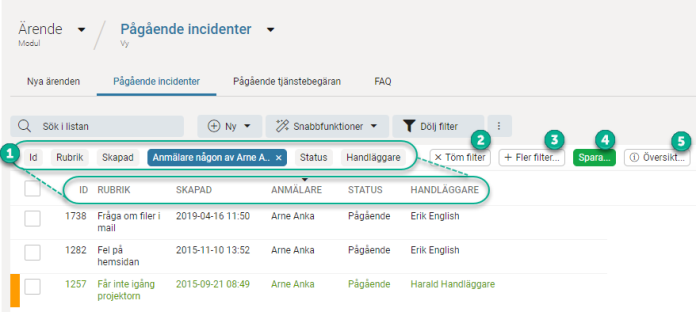 Filtrera innehållet i en vy genom att aktivera Filtrering via knappen Filtrera. Då visas en filterbricka för varje kolumn som finns i vyn. Genom att klicka på en eller flera filterbrickor kan du filtrera innehållet i vyn. Det går till exempel att filtrera en ärendevy på Status, så att endast pågående ärenden visas. Vill du ta bort ett filter klicka på krysset på filterbrickan. Vill du ta bort alla dina filtreringar klicka på knappen Töm filter.