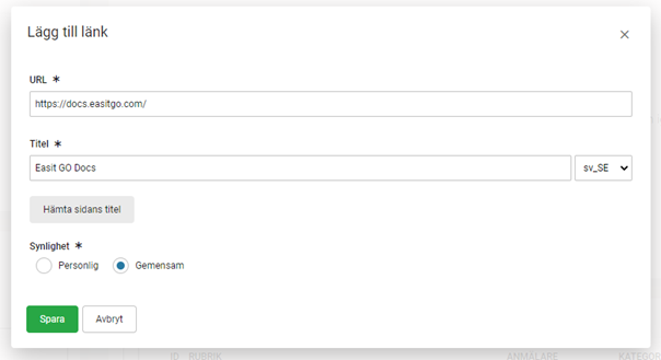 Via menyvalet Lägg till länk… öppnas en dialog, där du anger webbadress (URL) inklusive protokoll (t.ex. http://). Klicka på knappen Hämta sidans titel för att hämta titel, eller mata in en egen titel för din länk. Om du är administratör kan du välja om länken skall visas för samtliga användare (Gemensam) – annars blir länken personlig och endast du själv kan se den.