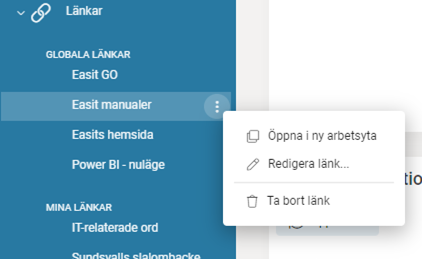Om du klickar på falafeln intill en befintlig länk visas en meny där du kan välja att öppna länken i en ny flik, redigera länken eller ta bort den: