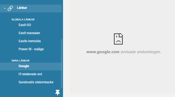 Med hjälp av funktionen Länkar är det möjligt att ha en lista med webbsidor som går att komma åt från Easit GO. Webbsidorna kan antingen visas i en inbäddad sida (IFrame) i applikationen, eller i en ny flik i webbläsaren.